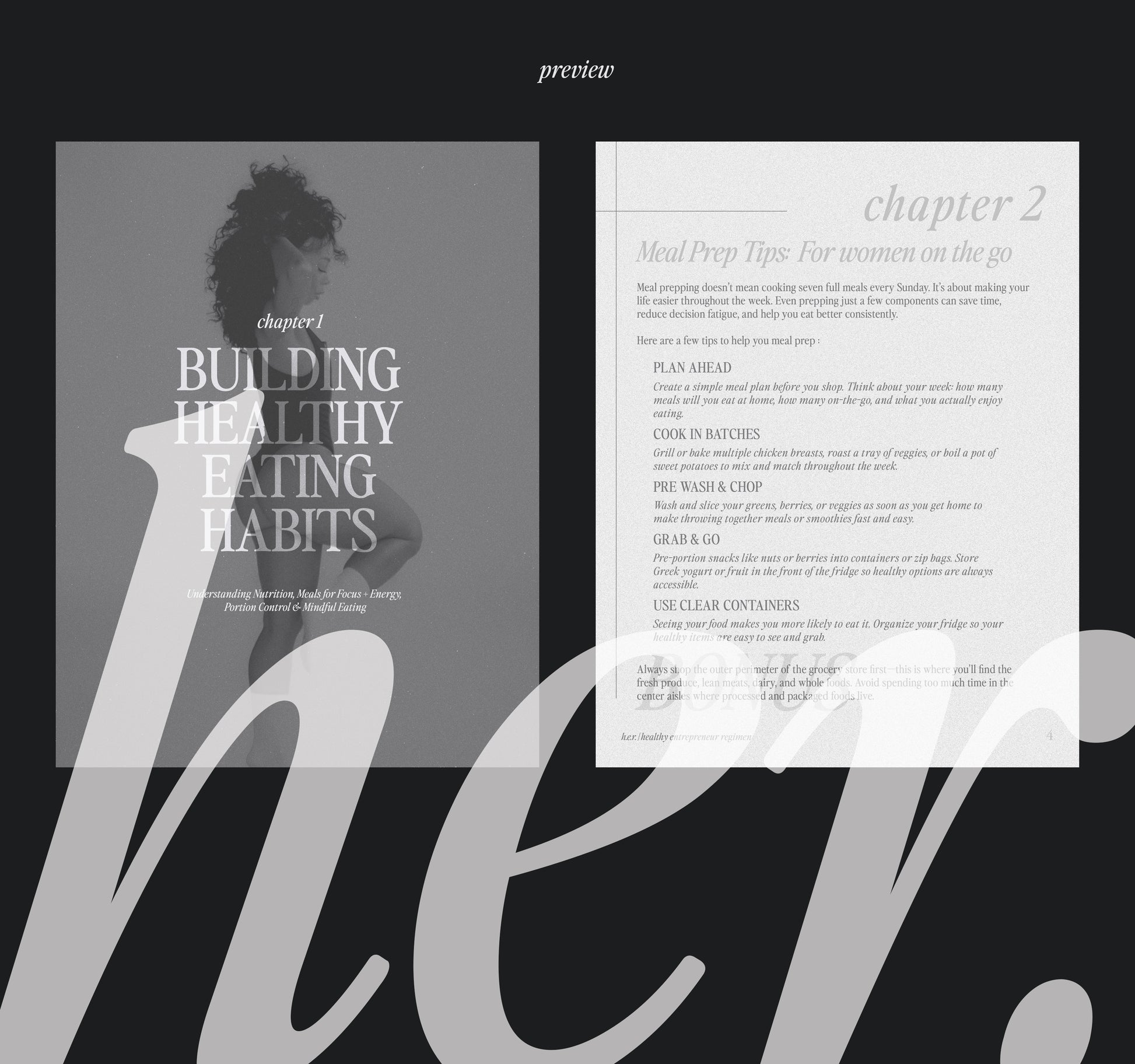 The Healthy Entrepreneur Regimen (HER) is a 30+ page wellness guide designed specifically for entrepreneurs, creatives, and go-getters who want to build their business without burning themselves out.